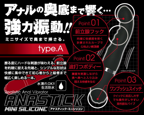 大人気のアナル用アイテム「アナスティック」に、新しい仲間が登場しました。このアナルバイブは、シリコン素材のマット仕上げで加工されていて、スムーズな挿入をサポートしてくれます。 ポイント1、前立腺フック 的確に快感部を突く計算されたカーブで心地よい絶頂感を味わえます。 ポイント2、波打つボディ 腸壁を刺激しながら奥へ奥へと入り込む悶える快感を生み出します。 ポイント3、ワンプッシュスイッチ クイックに反応し片手でも操作しやすい高性能なバイブです。