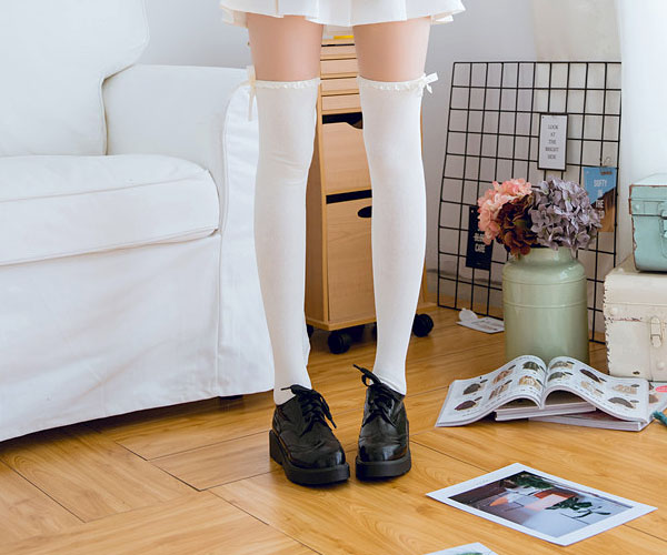 ニーハイに、サテンフリルレースとリボンをプラスした大人フェミニンストッキング♪使いやすい無地タイプなのでスカートやショートパンツとも相性抜群☆リボン部分は紐になっているので、お好みで小さめリボンや大きめリボンを作ることが可能です。伸縮性のあるしっかりとした生地なので履きやすさも抜群なニーハイストッキングになっています◎サイズ:22〜25cm