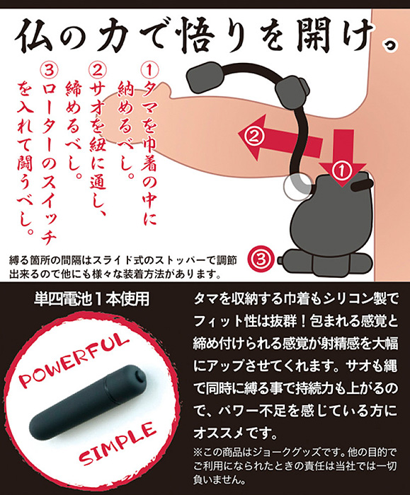 包むことで射精感のアップとコントロールを助太刀致す! サオを縛り玉袋を包み込む「SUKEDACHINAWA 仏」。タマを巾着の中へと納め、サオを紐に通し、締め上げます。サオを締めることで早漏防止、タマを包み込みローターのスイッチを入れ振動刺激することで勃起力や射精感を大幅にアップさせてくれます。パートナーにも振動が伝わるので、一緒に快感を楽しむことができます。ローターは着脱が可能なので、使用後のお手入れも楽チンです。射精のコントロールや勃起力アップが期待できる男性に心強いサポートアイテムとなっています!