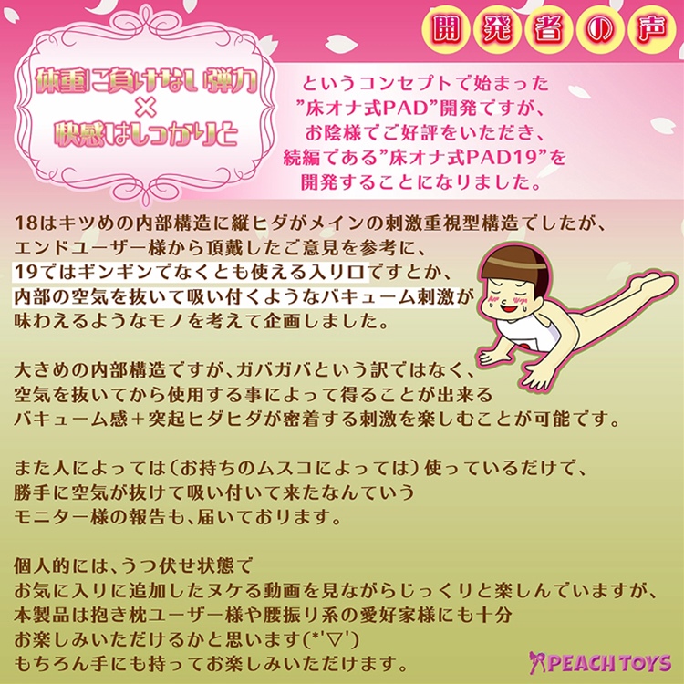 もう止まらない!この床オナは!重力に負けない弾力!快感はしっかりと!!ギンギンの状態でも即挿入可能な広めの入り口と、ミミズ千匹ヒダが猛烈に絡みつく刺激がたまりません♪嫌な臭いを軽減し、もっちりと吸い付くような弾力の質感。本体サイズ:24.0×Φ8.0cm重量:1400gパッケージサイズ:30.0×34.0×9.0cm