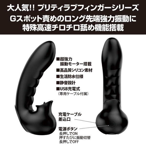 大人気!プリティラブフィンガーシリーズの最新作!!Gスポット責めのロング先端強力振動に、クリを責める特殊高速チロチロ舐め機能搭載!全長:10.5cmパッケージサイズ:17.5×9.0×4.5cm