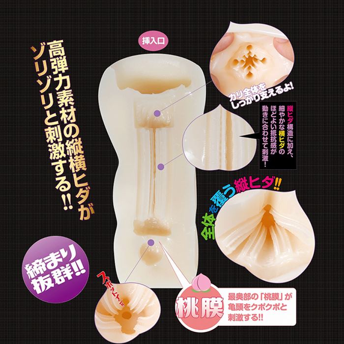 「桃ずきんちゃんdeもんもん!」にハードタイプが登場!縦ヒダ構造に加え、細やかな横ヒダのほどよい抵抗感が動きに合わせて刺激する。全体を覆う縦ヒダがカリ全体をしっかり支えて、締まり抜群!高弾力素材の縦横ヒダのゾリゾリ感がヤバイ!本体サイズ:15.6×Φ7.3cm重量:310gパッケージサイズ:20.5×13.5×7.5 cm