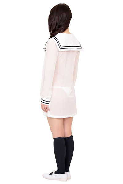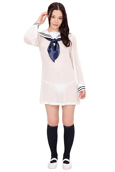 清純xシースルーは、どスケベの爆誕!心まで見透かす魅惑のシースルー。ワンピース部分は肌が透けて見えるストレッチのきいたネットメッシュを使用してセクシーさを演出しています。125cmの紺スカーフは胸元で結んでください。セーラーカラーの胸元の三角生地はスナップ2個で留めるデザインで、かぶりタイプのワンピースです。サイズ:着丈75cm、袖丈60cm、肩幅40cm、ウエスト80cm、ヒップ96cm、裾回り116cm、スカーフの長さ125cmセット内容:ワンピースセーラー、スカーフ