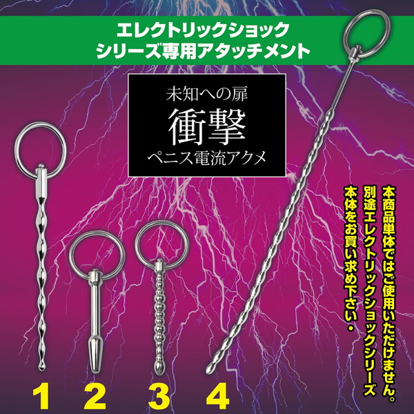 別売の「エレクトリックショック ブジー装着用 コックループアタッチメント」に接続してお好みのサイズで楽しめる専用ブジーアタッチメント。全体からビリビリと痺れる様な電撃低周波パルスで感じるブジー。重厚感のあるマニア垂涎のメタルボディ。※本商品単体ではパルスを発生させることはできません。本体サイズ:13.3×Φ0.5〜0.7cmパッケージサイズ:23.6×8.5×2.2cm