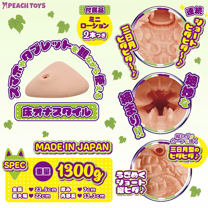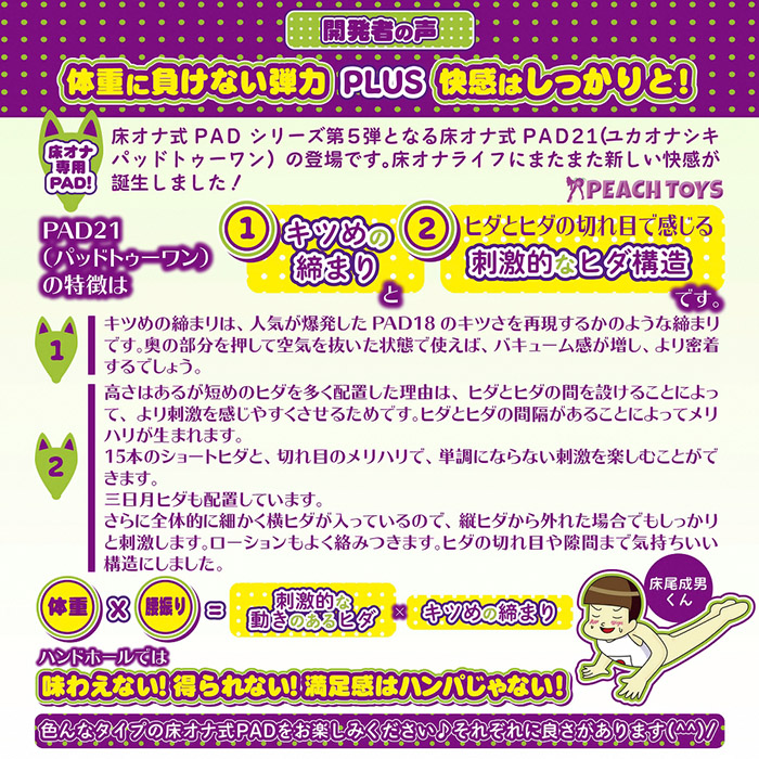 PAD21の特徴は、キツめの締まりとヒダとヒダの切れ目で感じる刺激的なヒダ構造です。キツめの締まりは、人気が爆発したPAD18のキツさを再現するかのような締まりです。奥の部分を押して空気を抜いた状態で使えば、バキューム感が増し、より密着するでしょう。高さのある短めのヒダを多く配置した理由は、ヒダとヒダの間を設けることによって、より刺激を感じやすくさせるためです。縦:23.5×W22×D6.5cm本体重量:1300gパッケージ:H30×W34僉D9cm