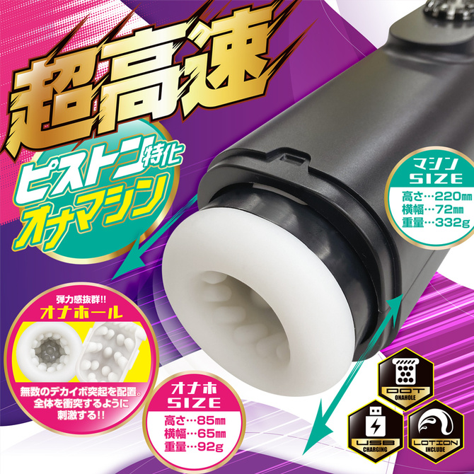 マッハ級のピストンで高速刺激! ハンドホールでは体験不可能な高速ピストンで、一気に絶頂まであなたを導く。 弾力感抜群の専用ホールは、内部に無数のデカイボを配置し、全体に衝突するように刺激。 シンプルで使いやすい操作性だから、一心不乱にプレイできる。 ホールは簡単に取り出せるので、メンテナンスもらくらく。 短期戦を制し速ヌキ速射!!爆シコでキメろ!!