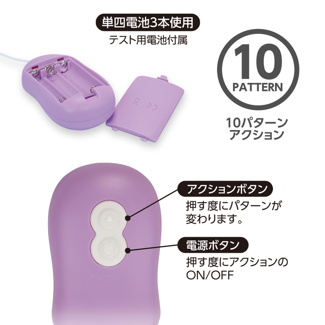 コードがコントローラーの下側から出ているのでセルフプレイの時も通常時もコードの煩わしさが軽減されたスタイリッシュデザインローター登場。単四電池3本を使用した4.5Vの強力振動マイクロモーター搭載の小径ローターに可愛いカラーバリエーション、さらにマット加工を施し、上質を極めた新型ローターです。10パターンアクション・ワンプッシュで簡単にON/OFF操作可能です。本体色:パープル【本体サイズ】コントローラーH80xW44xD25mm/ローターH40x直径18mm付属品:単四電池3本商品重量:105g
