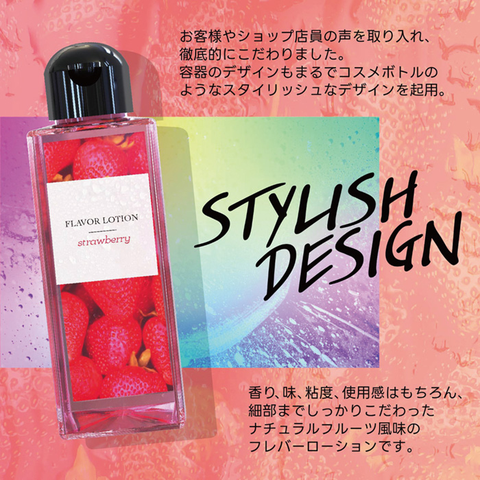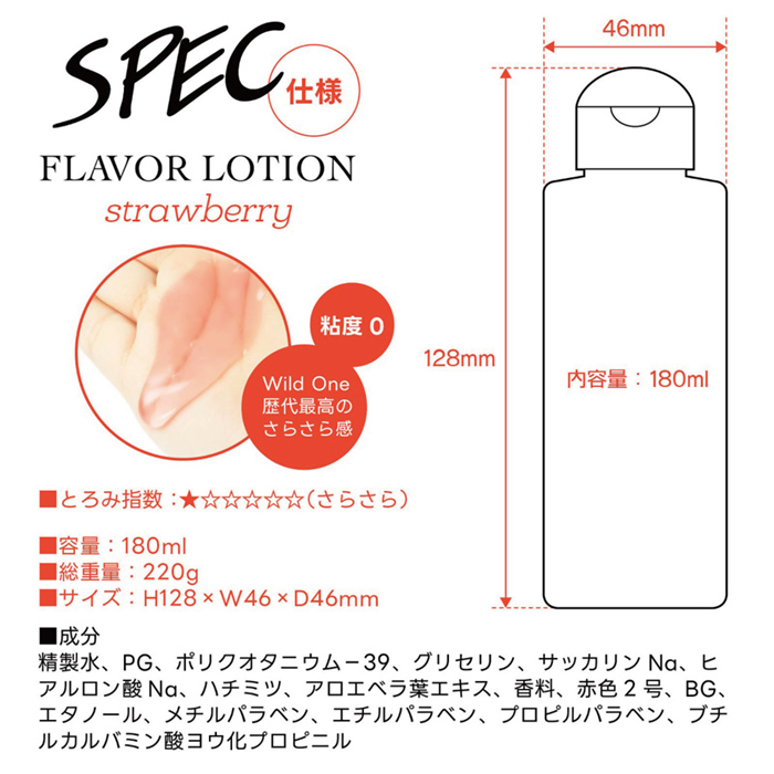 フルーティーな味と香りで新感覚プレイ!ワイルドワン女子が企画・開発した、女性のためのフレバーローション!安心安全の国内素材で、水のように「超さらさら」、フルーツみたいに美味しい水溶性ローションです!味も香りも甘酸っぱいストロベリー★甘い快感を味わおう♪※「本製品はバイブバー公式認定ローション 味・香り付き」の後継として開発されましたが味と香り付きという点以外は、成分もテクスチャもまったく異なる新製品です。パッケージサイズ:12.8×4.6×4.6cm内容量:180ml