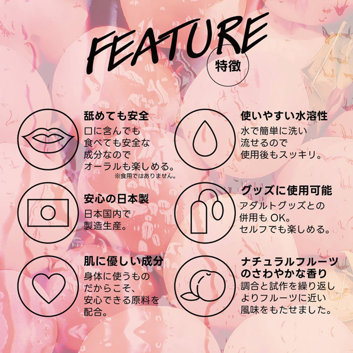 フルーティーな味と香りで新感覚プレイ!ワイルドワン女子が企画・開発した、女性のためのフレバーローション!安心安全の国内素材で、水のように「超さらさら」、フルーツみたいに美味しい水溶性ローションです!味も香りもふんわり優しいピーチ★甘い快感を味わおう♪※「本製品はバイブバー公式認定ローション 味・香り付き」の後継として開発されましたが味と香り付きという点以外は、成分もテクスチャもまったく異なる新製品です。パッケージサイズ:12.8×4.6×4.6cm内容量:180ml