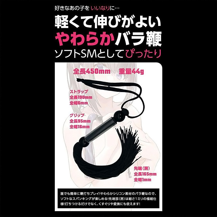 SMプレイの代名詞、SM専用バラ鞭「SMシリコンバラ鞭」! ビシッバシッと叩く音が響き渡る、 SMプレイでは欠かせない「鞭責め」をお手軽に始められるSMアイテムです。 細さ1ミリの柔らかいシリコン素材を束ねた黒い鞭ですので、 重さも軽く、初心者の方でも簡単に取り回しできます! 柔らかさがクッションとなり痛みになりづらいのですが、 バラけた鞭先からは大きい音が鳴り、鞭責めの興奮を強く煽るはず。 シリコン特有のサラリとした肌触りなので、不快感もありません。 全長260ミリ(ストラップ含まず)とやや小ぶりサイズなので、 軽い気持ちで手に取れまず。 遊びのつもりでビシバシしていると、いつの間にか鞭責めの魅力に惹かれてしまうかも!