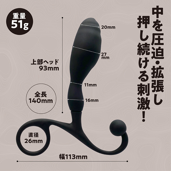 尻にいいアイカスにブラックバックシリーズが新登場!プレッシャーはその名の通りシリーズ最大径の27mmと拡張も視野に入れた初中級者モデル。シリコン部の全長140mm上部ヘッドは93mmと中を圧迫できます。会陰ボールも搭載しておりドライオーガズムを体験する第一歩のグッズとして最適です◎パッケージサイズ:18.8×11.0×3.8cm本体サイズ:14.0×11.3×2.7cm
