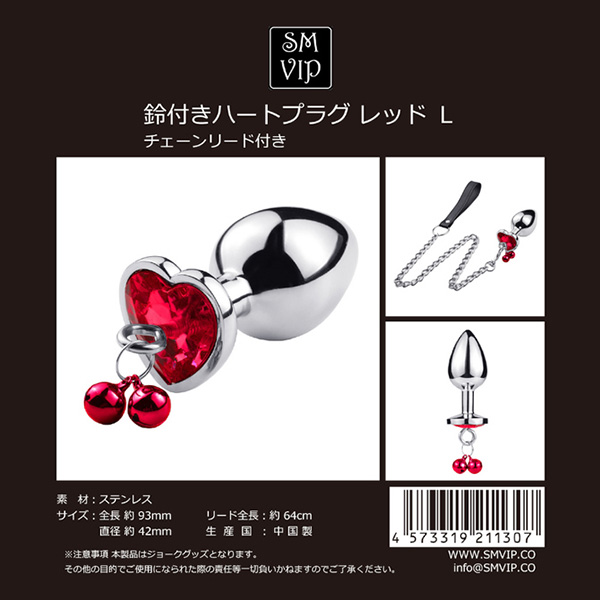 鈴の付いたハート形のア○ルプラグ☆鈴の音でお出迎えなんてかわいいですよね!チェーンリードを付けてお散歩するのはいかがですか?プラグとリードで使い方はいろいろです。高品質のステンレス製で表面は滑らかで先端が短く簡単に挿入できます。また使用後にきれいに洗浄することができ衛生的です。収納袋付きで1つずつ収納できるため、すり傷などを防止できます。Lサイズ本体サイズ:約9.3cm×約4.2cm重量:約169g