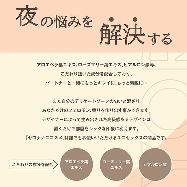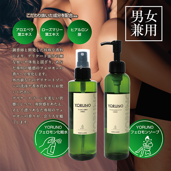 夜のお悩みを解決し、自分に自信をつけたいあなたへ…自分の気になるニオイをフェロモンに。調香師とともに開発した、ベースフェロモンの香りが気になるアソコの蒸れたニオイと混ざり、あなた専用のフェロモンの香りに。ハトムギ種子エキスはニオイの抑制、乳酸桿菌発酵液とヒアルロン酸ナトリウムは潤いを与えます。全身にも使用できるので普段遣いにもおすすめです。パッケージサイズ:18.0×4.8×4.8cm内容量:200ml