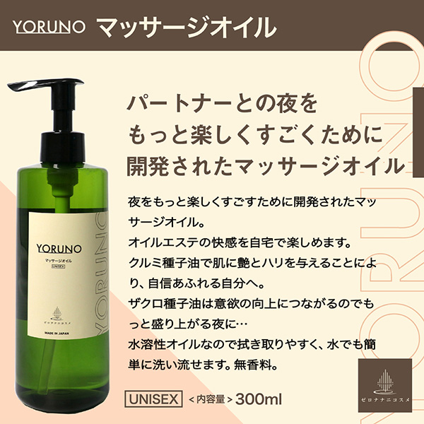 夜をもっと楽しくすごすために開発されたマッサージオイル。オイルエステの快感を自宅で楽しめます。クルミ種子油で肌に艶とハリを与えることにより、自信あふれる自分へ、ザクロ種子油は意欲の向上につながるのでもっと盛り上がる夜に…水溶性オイルなので拭き取りやすく、水でも簡単に洗い流せます。無香料パッケージサイズ:19.5×5.5×5.5cm内容量:300ml