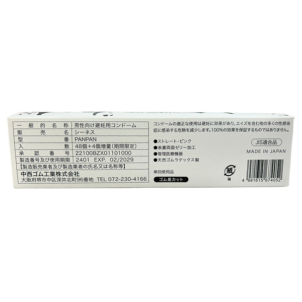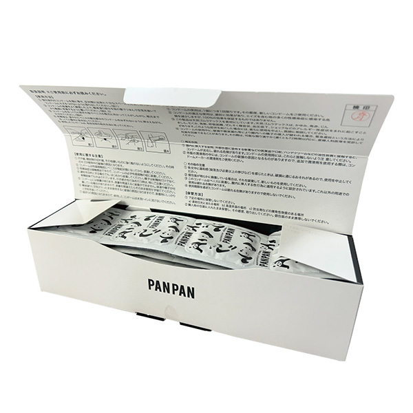 パッケージ&個包装が可愛いパンダ柄☆【特長】・日本製・ストレートタイプ・Mサイズ・最薄部0.03mm※測定箇所により0.04mm台の部分もあり。・ピンクカラー・男性側・女性側 両面ゼリー付き・製品サイズ:直径33mm 長さ200mm(ロットにより若干、数値が異なります)・化粧箱サイズ:W24×H6×D6cm・ラテックス製パッケージサイズ:H6.0×W23.8×D6.0cm内容量:52個入