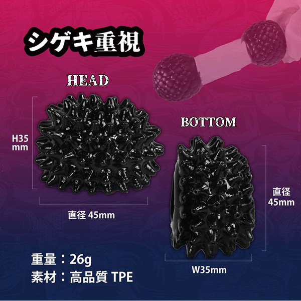 先端と根元、2つに分かれたセパレートサック。刺激したい部分だけ装着して感触と温もりを損なわない2個セットサック。柔らかくてしっかり伸びる高品質素材採用でストレスフリーな付け心地を実現しました。先端だけ装着したり、根元だけ装着したり、好みに合わせて使用方法を選べます。ツブツブ突起の刺激重視タイプパッケージサイズ:H10.5+ヘッダー3×W6×D5cmヘッド:H3×直径5cmボトム:H2.7×直径4.8cm