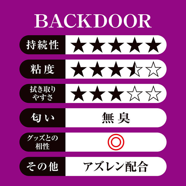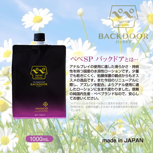 人気ナンバーワンのバックドア用ローション「ぺぺSP バックドア」。詰め替えにも便利、たっぷり使える大容量サイズで登場です。何と言ってもバックドアプレイで大切なのは「適した潤滑性」と「粘度の持続性」ではないでしょうか。アズレン(※)を配合し、より快適な使用感を実現しました。また1000mLの大容量サイズなので、詰め替えなどお得に使えます。高粘度、かつ優れた持続性・潤滑性のぺぺSP バックドア。パッケージサイズ:H20×W13×D7.5cm内容量:1000ml