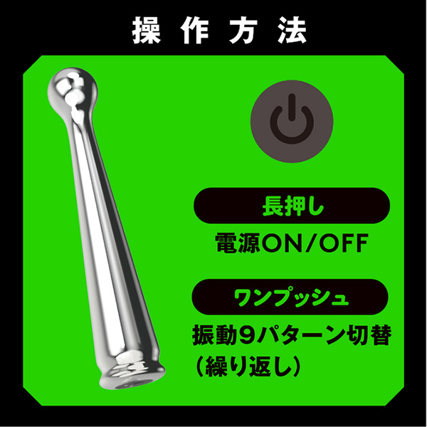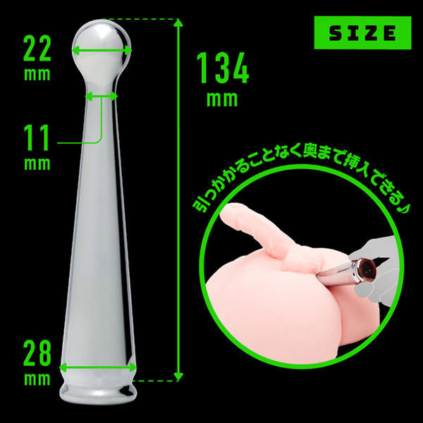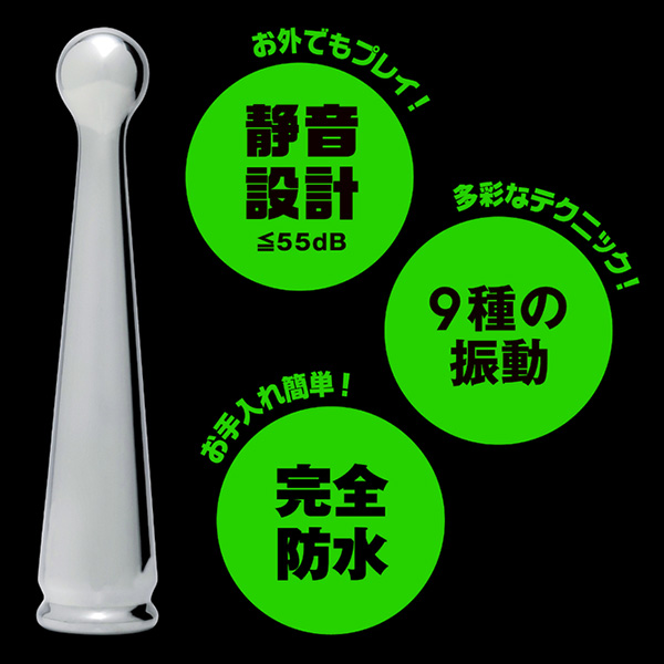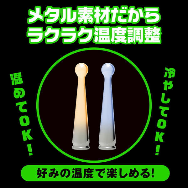 メタルの重厚快感!ツルツルの質感でするんと簡単挿入!完全防水仕様なので、使用後の丸洗いも可能で清潔に保てます。先端のボールで気持ちいいトコロをピンポイントに刺激できます◎冷やっとしたメタルの質感を楽しむも良し♪温めてとろける温感プレイを楽しむも良し♪お好みの温度に調整できて色んなプレイが楽しめます!※本体:充電時間約140分(供給電力量によって変わります)※本体:最大連続稼働時間約50分(初期振動パターン未変更時)パッケージサイズ:15.5×12.0×5.0cm本体サイズ:14.1x2.9x2.9cm本体重量:95g付属品:USB充電ケーブル