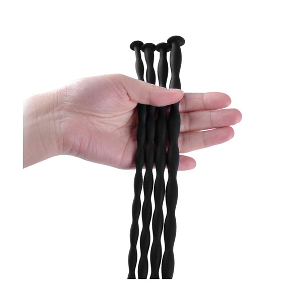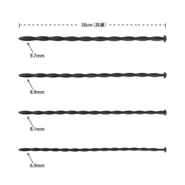 尿道オナニーの歓びを知るマニアに捧ぐ、太めの4本!!直径が異なる4本がワンセットのお得版。一番太いもので女性の小指ほどの太さ。しなやかでよく曲がるシリコン製なので表面もサラサラ、内部にもやさしく刺激します。太めなので中級者〜上級者対象です。【ご注意】使用前にローションよく塗布してからからご利用ください。いちばん細いプラグからお試しください。 この商品はジョーク商品です。過度の使用等のトラブルに対しては 一切の責任を負いませんので、予めご了承ください。パッケージサイズ:22×14×10cm本体サイズ:長さ30cm×‖世0.97cm0.89cm0.81cm0.69cm