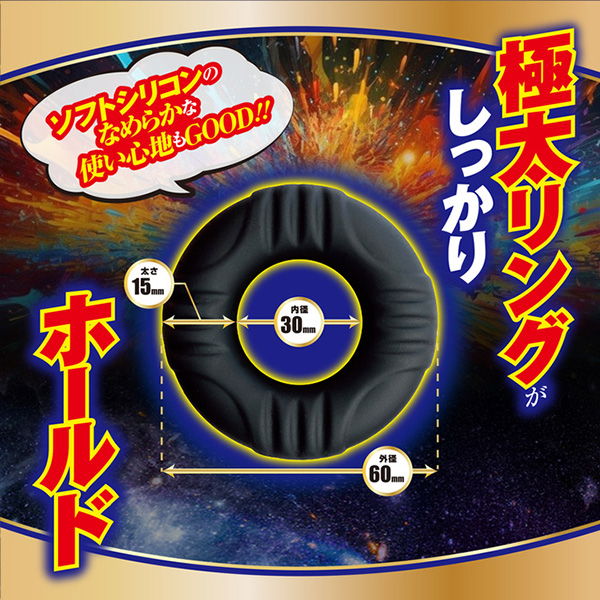 極太リングでしっかりHOLD!はんぱない装着感!リングを装着しエネルギーチャージ。圧倒的爆発力で、すべての力を放て!攻守ともに優れたソフトシリコンリング。タマやサオ、その両方をガッチリホールドし、最後の一撃に込めるべし!【本体サイズ】・外径60mm・内径30mm・太さ15mm重量:50gパッケージサイズ:15.2×10.2×2.5cm材質:シリコン