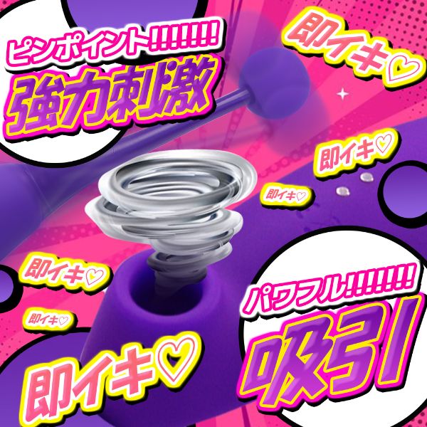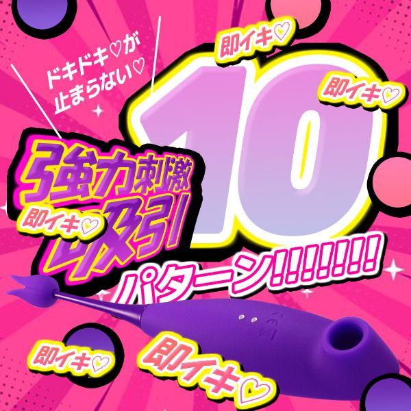 性感帯を徹底的に刺激する為、パワーアップして登場! 10種類の激震と10種類の吸引で内からも外からも快感が爆発! バイブレーションには超強力モーターが内蔵されて、ピンポイントの刺激で潮吹絶頂! 刺激が強すぎる為、2種類のシリコンアタッチメントを付属。 クリイキ特化責めの吸引機能は10種超音波変速吸引!クリや乳首にピッタリとフィットし密着吸引!