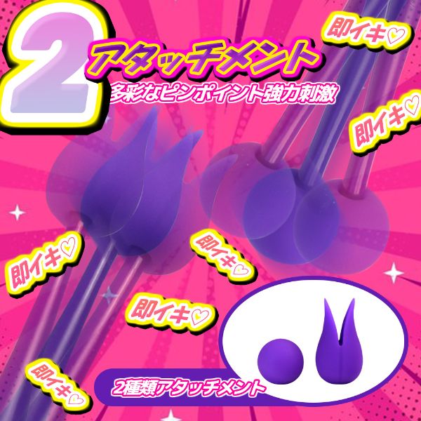 ピンポイント刺激が強すぎて秒イキしてしまう為、アタッチメントでのプレイもお楽しみ頂けます。 挟み型のヘッドはクリや乳首を優しく包み込み振動します。 丸型のヘッドは刺激部分を広くすることで、優しく深部へ振動を伝えます。