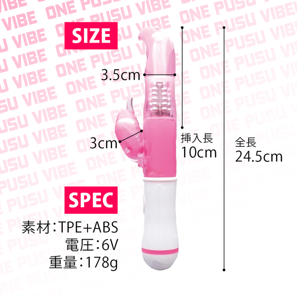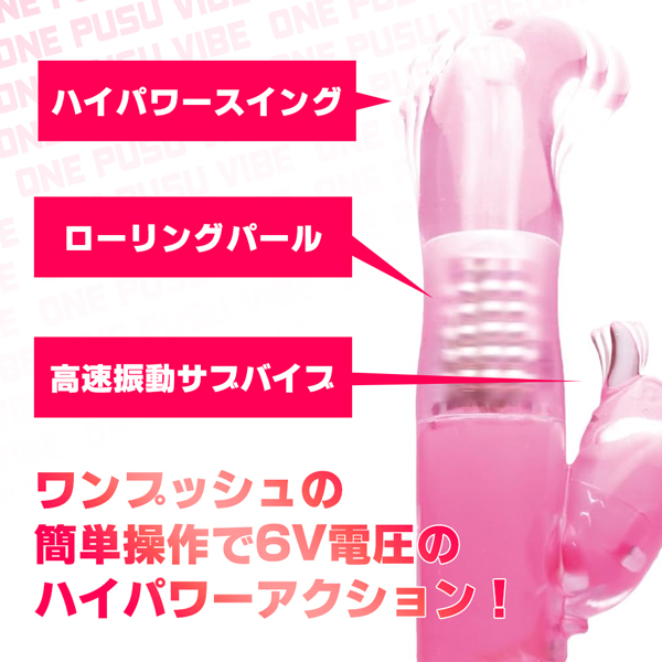 ワンプッシュで強力なスイングとパールローリングで悶絶!ボタン1つで強力スイング&パールローリングのアクションを実現したスタンダートバイブ!!サブバイブも高速振動します!初心者でも使いやすいシンプル&スタイリッシュなバイブです。ワンプッシュでハイパワーを堪能してください!本体サイズ:全長:24.5cm(挿入可能長:10cm・挿入部最大径:3.5cm・サブバイブ長:7cm・サブバイブ径:3cm)総重量:236g (本体178g)本体重量:178g付属品:単四電池4本