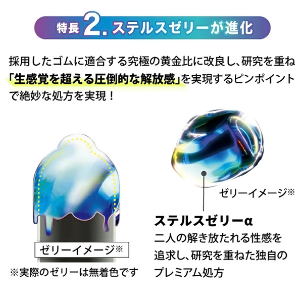 《特長》 ●大きめ Largeサイズ ●圧倒的解放感を実現した新型ステルスゼリーαを搭載 ●ステルスコート:コンドーム使用時の違和感を解消する独自のゼリー技術 ●より伸びやすく柔らかい優れたフィット感のラテックス製 ●ゼリーの良さを最大限に引き出すブリスター個包装 ●ナチュラルタイプ ●無着色 ●日本製