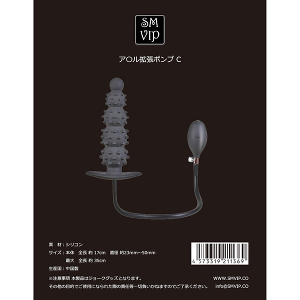 アナル拡張で性感開発☆ア〇ルの開発をすすめるうえで、安全なア〇ル拡張器は必需品です。大きく太く膨らみます。最大直径約10センチ!新鮮な刺激を味わうこともできムリなくア〇ルの深い快楽に陶酔できることでしょう。タイプCはイボイボ多めのタイプです。一人でもパートナーとのプレイでも、いつもと違うちょっとマニアックな感覚が楽しめるアイテムです。極限の快楽を味わう反応も楽しめます。プラグ内の空気はワンタッチで放出でき苦しさから瞬時に解放される安心感があります。パッケージサイズ:26.5cm×18cm×4cm本体サイズ:18cm 先端直径約3cm