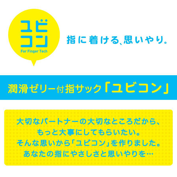 指に着ける、思いやり。大切なパートナーの大切なところだから、もっと大事にしてもらいたい。そんな思いから「ユビコン」を作りました。あなたの指にやさしさと思いやりを・・・商品サイズ:全長 6cm×内径 1.8cm〜内容量:6個入りパッケージサイズ:H9.0×W6.0×D2.5cm