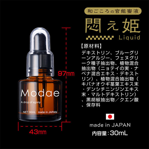人気の悶え姫シリーズより、ドリンクに混ぜるだけの官能蜜液が登場です。使い方は簡単、ドリンクに一、二滴混ぜるだけ。目眩く官能的な時間を楽しめるかもしれません。製造は日本国内の食品工場で作られており、安心・安全な成分でできています。パートナーとの熱い夜をお楽しみください。※大量に混ぜるとドリンクの味が変わる恐れがあります。ご注意ください。パッケージサイズ:H12.5×W4.4×D4.4cm本体サイズ:9.7×4.3×4.3cm 内容量:30ml