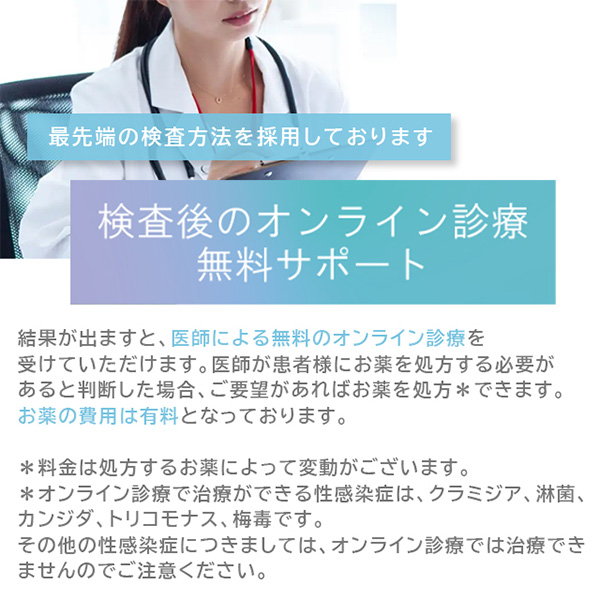 結果がでると、医師による無料のオンライン診療をお受けいただけます。 医師が患者様にお薬を処方する必要があると判断した場合、ご要望があれば有料となりますがお薬の処方ができます。