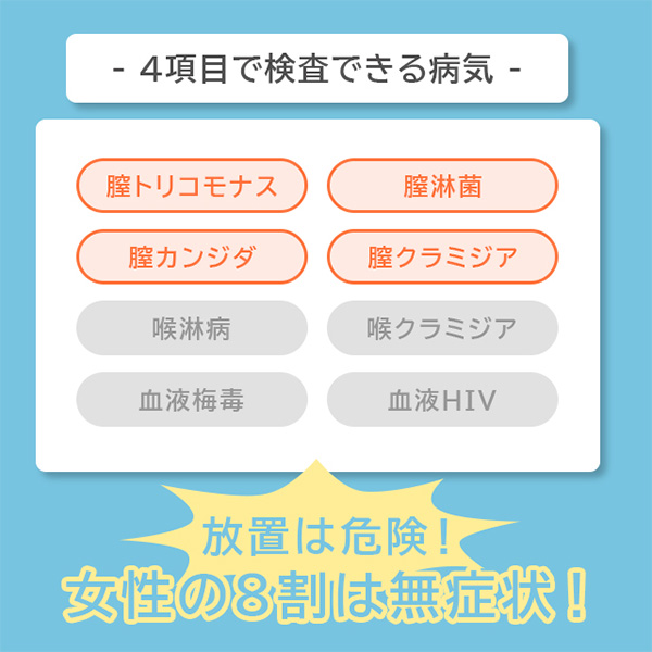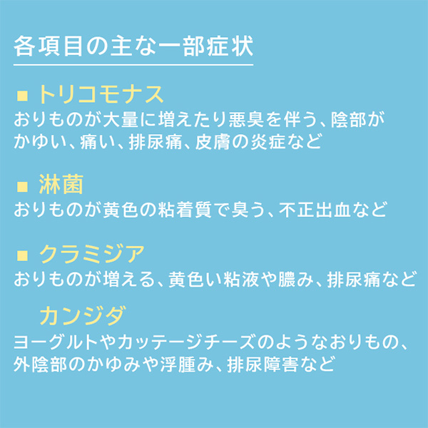 【性器淋菌】 【性器クラミジア】 【性器トリコモナス】 【性器カンジダ】 の検査ができます。