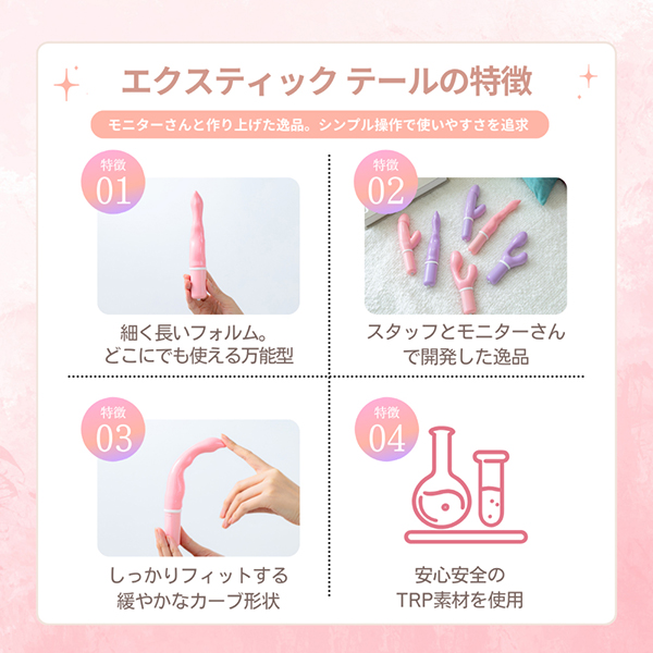 シリーズ累計27万本販売した「 ECSTICK(エクスティック)」シリーズ。隙間にぴったり!指より感じる、奥まで届く虜になるカタチ・快感に集中するためのシンプル仕様・3段階の振動レベル・単4電池 x2本付属・静音設計・素材: 柔らかくて肌に優しいTPR素材を採用(TPR、ABS)シンプルかつ柔らかく、アダルトトイデビューにもぴったりなシリーズです。本体サイズ:20.5×3.0×2.9cmパッケージサイズ:26.5×11.0×3.5cm【単四電池×2本使用】