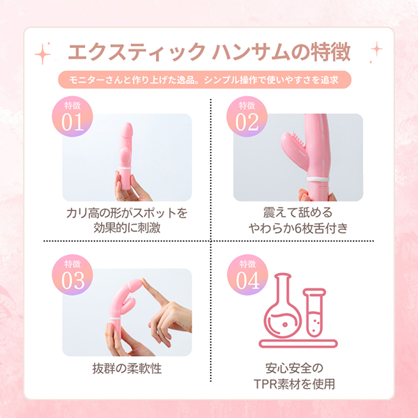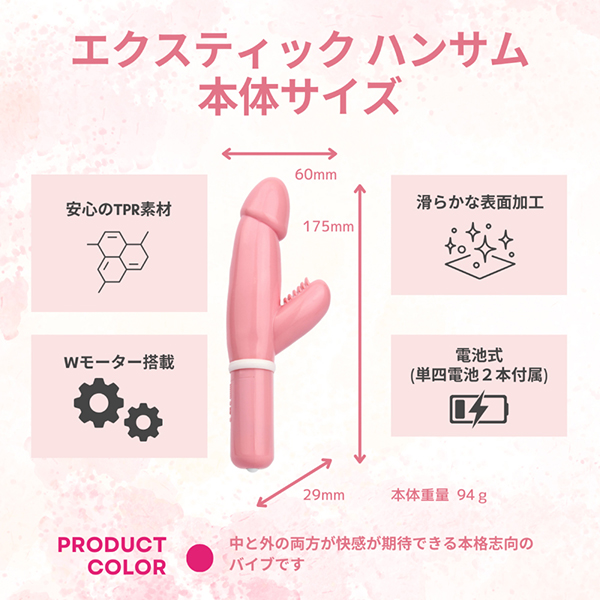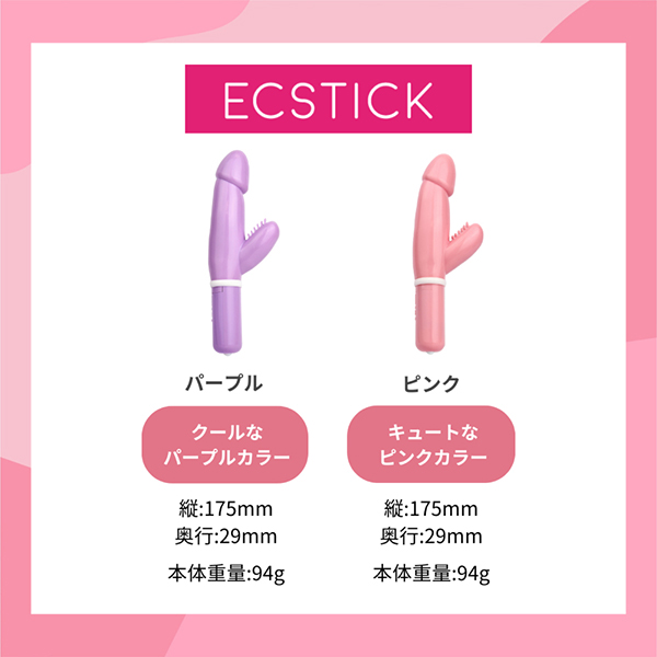 シリーズ累計27万本販売した「 ECSTICK(エクスティック)」シリーズ。本物感覚で即快感。長すぎず、太すぎず、理想的なサイズ虜になるカタチ・ダブルモーター仕様で同時に刺激・快感に集中するためのシンプル仕様・3段階の振動レベル・単4電池 x2本付属・静音設計・素材: 柔らかくて肌に優しいTPR素材を採用(TPR、ABS)シンプルかつ柔らかく、アダルトトイデビューにもぴったりなシリーズです。本体サイズ:17.5×6.0×2.9cmパッケージサイズ:23.5×12.0×3.5cm【単四電池×2本使用】