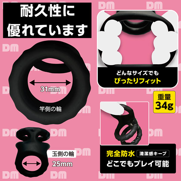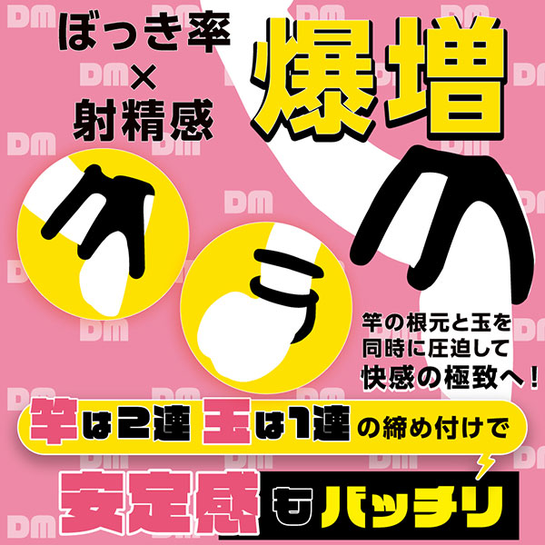 竿の根元2箇所と玉の付け根をがっちり締め付け。竿をしっかり支える圧迫感強化タイプ。竿と玉を締め付けて、膨張感と持続力をアップするコックリングです。【みつがさね】は2本のリングで竿をしっかり支えることで膨張力と持続力をアップ。さらに玉を後ろから持ち上げるように締めつけることで射出量を向上させます。2点同時締め付けで普段とは段違いの硬さ、持続力、射出量をサポート。竿側の内径:3.1cm 玉側の内径:2.5cmパッケージサイズ:H14.5×W7.3×D5.0cm