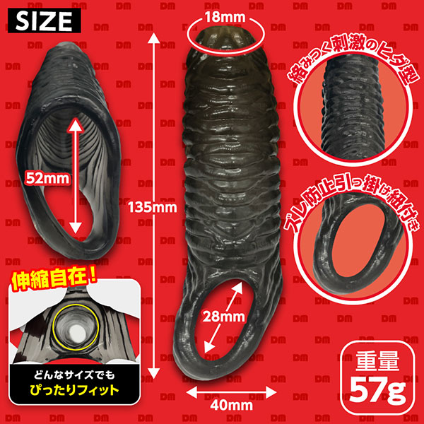 太く逞しい竿でパートナーの絶頂を、先端露出で自分自身の快感を。2人とも満足できる貫通型サック!先端に穴が開いており、先っちょを露出することができるサックです。装着する事で普段より太く逞しい竿を手に入れることができます。先端を露出できる貫通型なので、装着者自身も快感を得られ、そのまま発射することも可能です。全長:13.5cm リング内径:2.8cmパッケージサイズ:H14.5×W7.3×D5.0cm