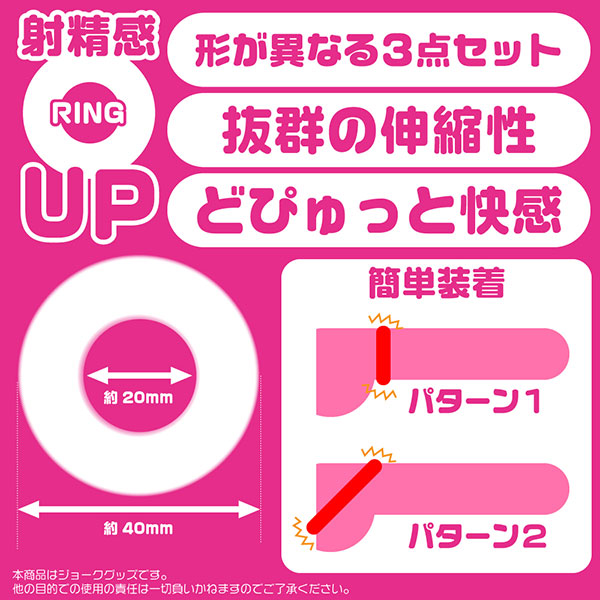 いつものプレイに手軽にアクセント。膨張率・快感をサポートする締め付けリング3個セット。装着部位をググっと締め付け、膨張感と快感をアップさせるリング3種セットです。伸縮性抜群のソフトシリコン製で様々なサイズの方にしっかりフィット。形状の違う3種のセットなので、最初は1つから、慣れてきたら好みの組み合わせでさらに楽しむことができます。内径:約1.8〜2.0cmパッケージサイズ:H15.0×W9.4×D1.0cm