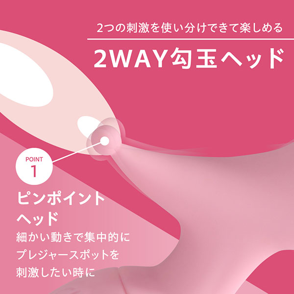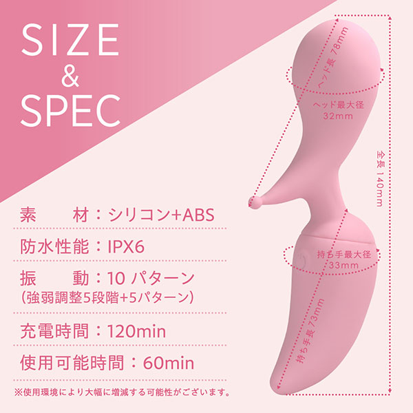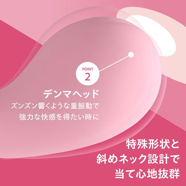 ピンポイント刺激とズンズン電マ刺激の両方を楽しめる勾玉型の可愛いデンマです。2WAYヘッドが特徴でネックに少し角度をつけているのでセルフプレイにも最適です。上質で静音×高速振動モーターを採用した振動パターンは強弱調整を細かく5段階+実用性の高い5つの振動パターンの計10パターンをお楽しみ頂けます。オールシリコンボディの優しくしっとりとした感触がストレスフリーな使用感を演出します。全長:14.0cm ヘッド長:7.8cm ヘッド最大径:3.2cm 持ち手長:7.3cm 持ち手最大径:3.3cmパッケージサイズ:H16.4xW10.4xD4.1cm【USB充電式】