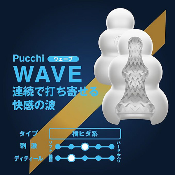 【従来のプッチから潤い成分「プラスウェッチ」を60%増量(当社比)しました。使用する軟性樹脂をより滑らかな肌触りのいいものへ昇華させ、まさにプレミアム品質に仕上げました。内部構造は全12種。王道の確かな刺激はプレミアム素材にぴったり。初心者から、通な方真で幅広く満足していただけます。【ウェーブ内部構造】「連続で打ち寄せる快感の波」ウェーブ状のヒダが絶え間なく打ち寄せる快感の波をもたらす全長:7.0cm 直径:5.0cm 重量:34g非貫通/ローション付】