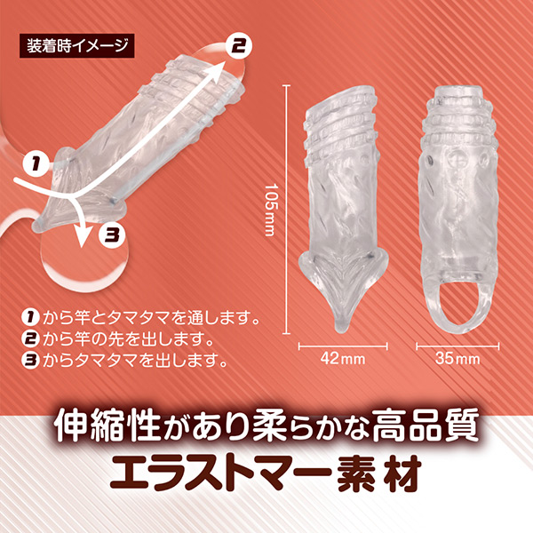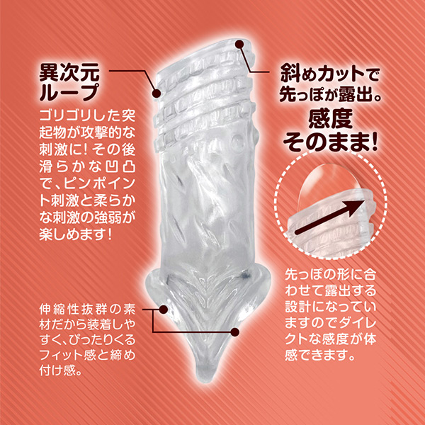 攻撃力と防御力を同時にサポート!素材はエラストマーなので伸縮性があり幅広いサイズの方にご使用頂けます。無限ドット、螺旋ヒダ、異次元ループ、カリ&ヒダの4種の中からお好み刺激をパートナーと楽しんでください。本体サイズ:10.5×4.2×3.5cmパッケージサイズ:H14.9×W8.0×D5.0cm