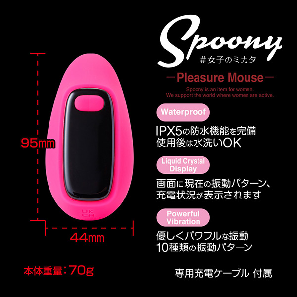 レジャーマウスはかわいくパワフルなローターです。ポイントにフィットしやすく、しっかりと振動を伝える形状です。またソフトな肌触りと10種類(3段階の強弱と7パターンの振動)の振動を装備し、機能面でも充実しています。振動の様子は手元の液晶画面で確認でき、便利に遊ぶことが可能です。充電は付属のUSBケーブルで簡単・便利。使用後は水洗い可能な防水機能(IPX5)も完備し、清潔さを保ち続けます。本体サイズ:H9.5×W4.4×D5.2cmパッケージサイズ:H19.0×W8.3×D6.6cm【USB充電式】