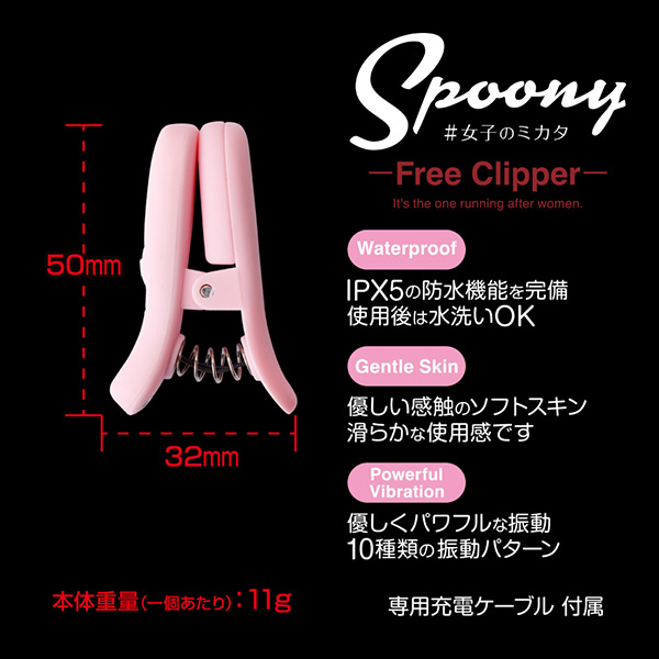 このフリークリッパーはクリップ型のローターです。ポイントにしっかりとつまみ、振動を逃さず伝えます。つまむ力は強力ですが、優しい感触で痛みはほとんどありません。またソフトな肌触りと10種類(3段階の強弱と7パターンの振動)の振動を装備し、機能面でも充実しています。充電は付属のUSBケーブルで簡単・便利。本体サイズ:H9.5×W4.4×D5.2cmパッケージサイズ:H5.0×W3.2×D1.4cm【USB充電式】