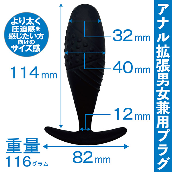 アナルを広げてプレイの幅を広げる、アナル拡張用プラグ。最大幅40mmと、アナル拡張ベテランにもおすすめしやすい大型サイズです。長期間挿入して生活することで、徐々に拡張できます。硬すぎないソフトシリコン製で、緩やかなカーブを描いており、スムーズに挿入できて安心。洗浄も簡単なので清潔に使用できます。挿入部:11.4cm 最大径:4.0cm 最小径:1.2cmパッケージサイズ:H14.0×W8.7×D5.0cm