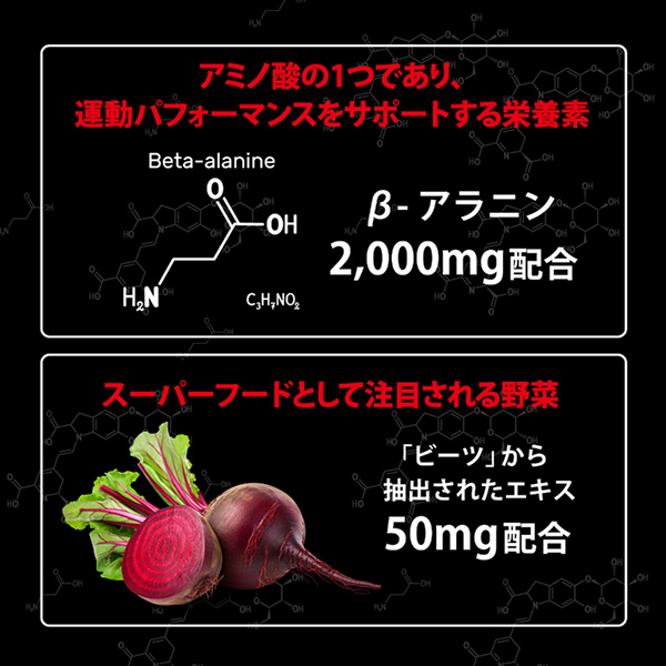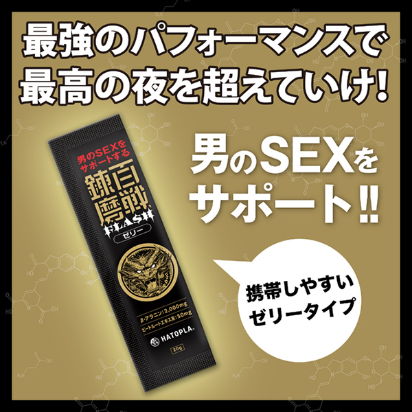 男のSEXをサポートする!! 勝負の前のゼリー「百戦錬磨FLASHゼリー」お試しください★ アミノ酸の1つであり、運動パフォーマンスをサポートする 栄養素「β-アラニン」を2,000mg配合。 スーパーフードとして注目される野菜「ビーツ」から抽出されたエキスを50mg配合。最強のパフォーマンスで最高の夜を超えていけ!! ※β-アラニンを摂取すると、顔、首、手などにピリピリ感を生じる場合があります。 この感覚はβ-アラニンフラッシュと呼ばれ60分〜90分間続く可能性がありますが、β-アラニン特有の体感で副作用とみなされる有害現象ではありません。