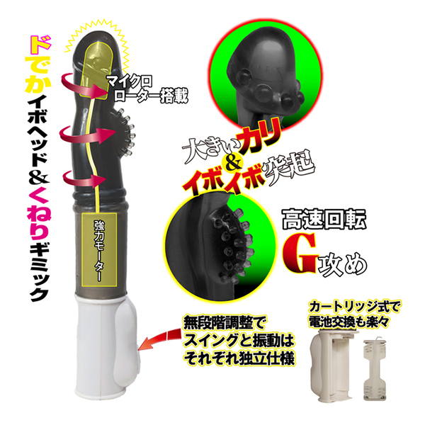 限界突破!くねりギミック搭載でG攻め激イキバイブ! 最大径約42mmの極太カリにイボイボ突起搭載! ぐりぐりぐねぐねとヘッドの動きに我慢の限界。 内臓されたマイクロバイブの強振動で内壁を超刺激まさしく限界突破! カリの下には、G攻め用のイボイボ突起の集団が待ちかまえる。 リズム感ばっちりのくねりギミック&6Vパワーの高速回転、刺激の応酬で潮吹き激イキ間違いなし! 電池を入れればすぐに使える楽々コントロールBOX。 無段階調整スイッチでお好みの速度と振動でお楽しみいただけます。 単4電池4本使用(アルカリ乾電池推奨)静音タイプ