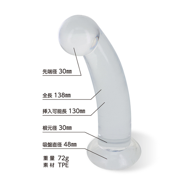 つるんとシンプルなフォルムが可愛い★透明度の高い高品質クリアTPE素材を採用しました。とにかく抵抗が少ないスマートで滑らかな形状と透け感が特徴です。もちっと弾力のある感触が程よいリアル感を演出しています。壁や床にしっかり吸着する吸盤付き。本体サイズ:13.8×4.8×4.8cm重量:72gパッケージサイズ:15×6×5.5cm
