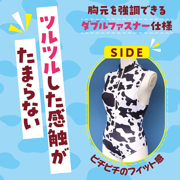 ファスナーを開けてセクシーな胸元に 「牛柄フロントファスナー競泳水着 おとこの娘用」