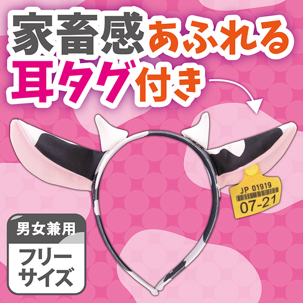 頭に着けるだけで雌牛になれちゃうコスプレアイテムです! 内側がピンク色でカワイイ牛耳、ちょこんと出た小さ目のツノに加えて、右の耳には牛耳タグも付いています! タグの番号は01919(イクイク)と07-21(オナニー)――細かな部分までこだわったカワイイカチューシャです。