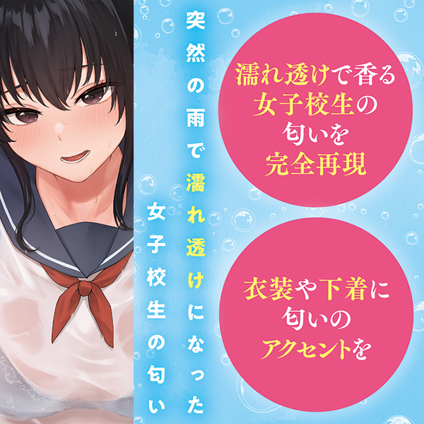突然振り出したゲリラ豪雨に雨宿りする美少女を描いた パッケージが特徴的なタマトイズのフレグランス「濡れ透け女子校生の匂い」。 少女をイメージさせるフローラルな香りと、雨や重たい湿度を 連想させるマリン系の匂いが交じり合った心地のいい香りです。